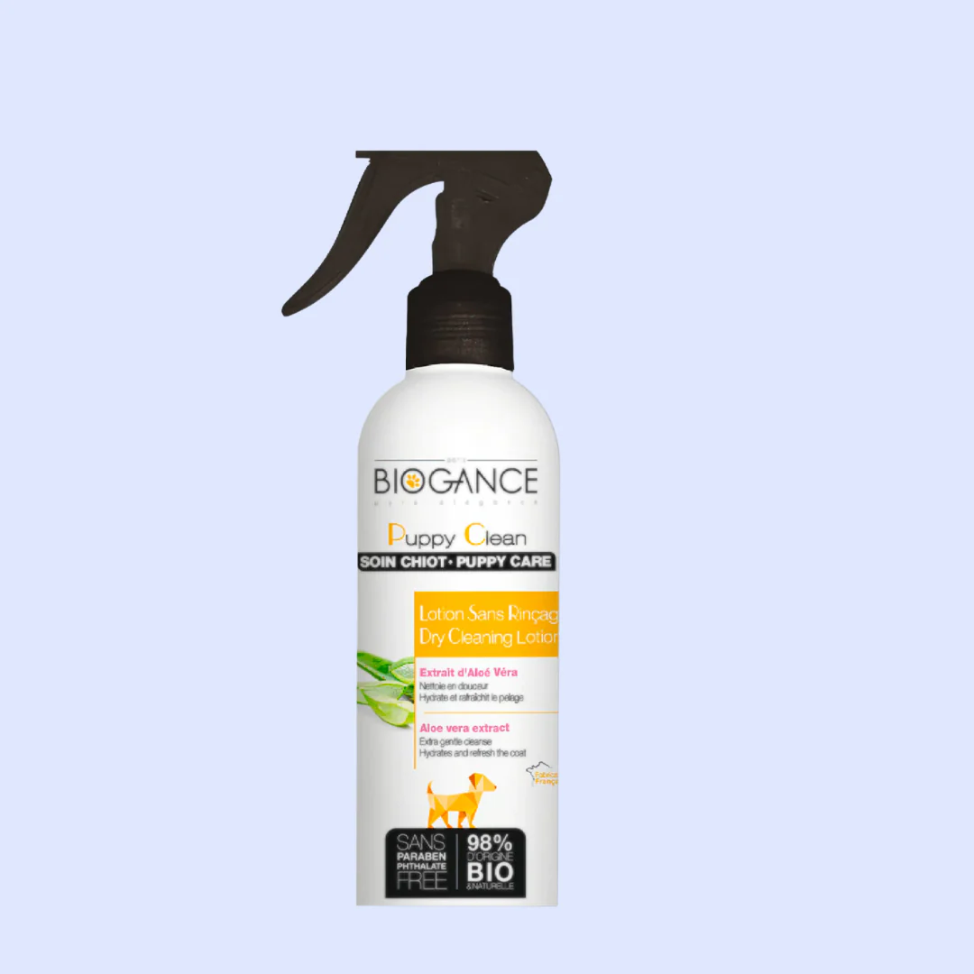 La lotion No Rinse Puppy de Biogance est spécialement conçue pour offrir un nettoyage doux, hydratant et rafraîchissant au pelage des chiots. Formulée sans rinçage, elle est enrichie en extrait d’Aloé Véra et de Capucine pour prendre soin de la peau sensible des jeunes compagnons à quatre pattes.