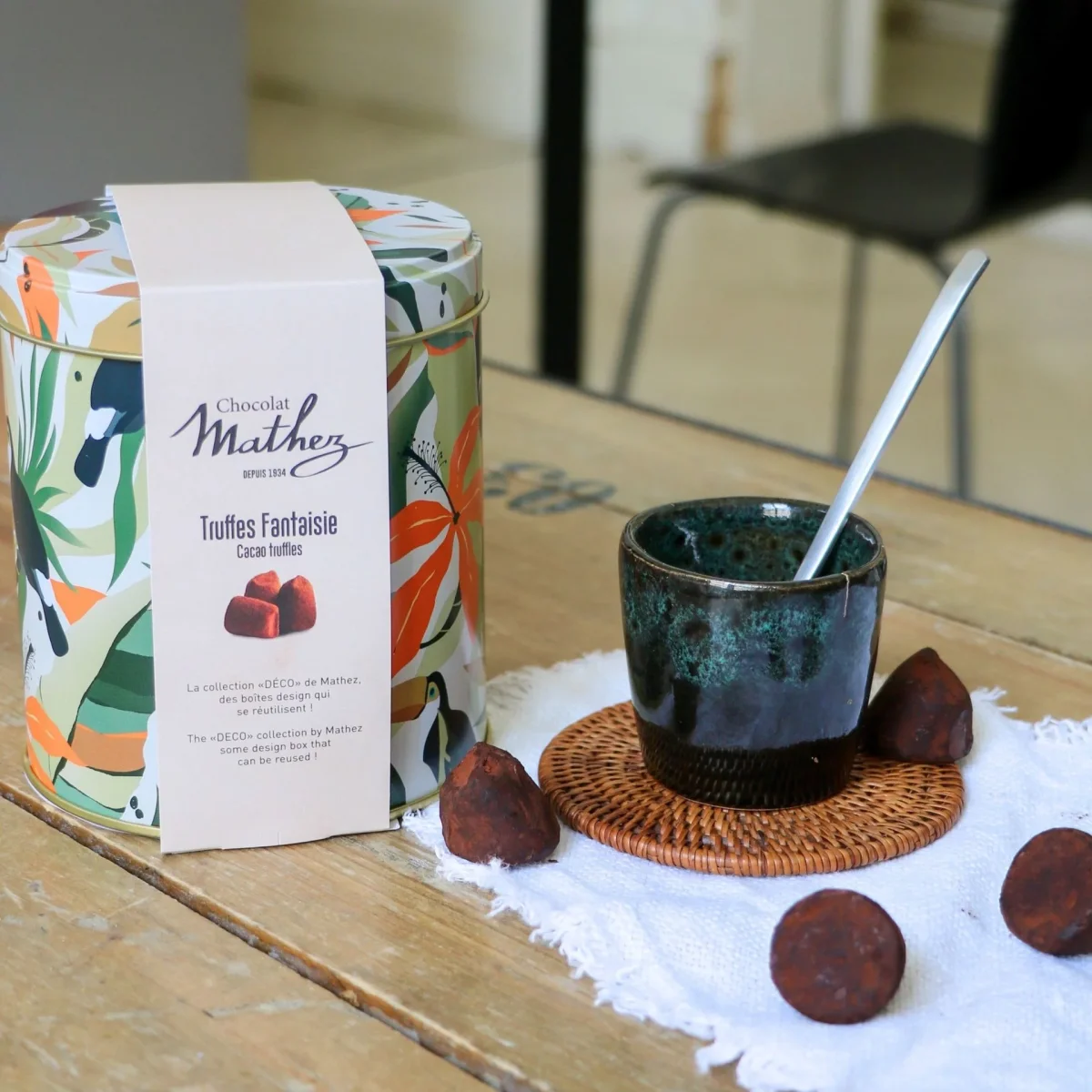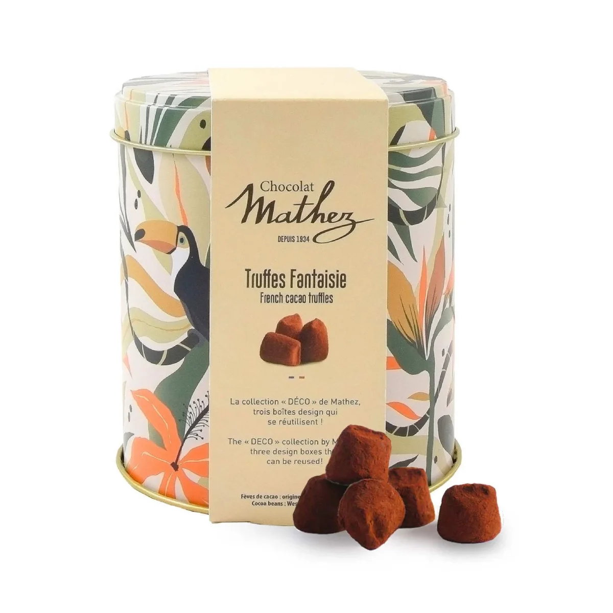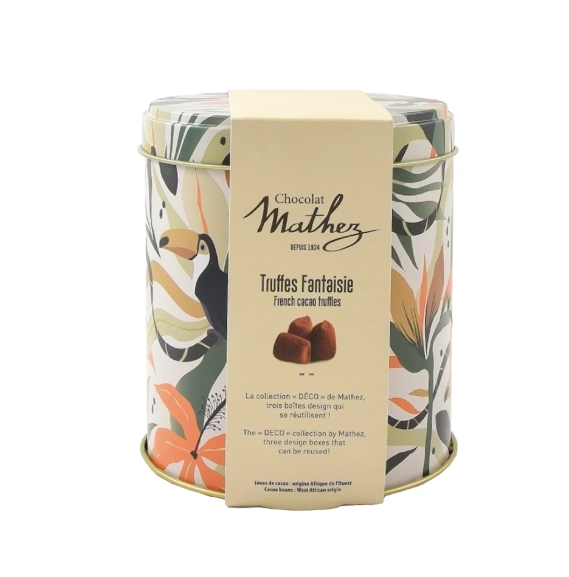 Des truffes tendres et fondantes avec un bon goût de cacao dans une magnifique boite métallique dorée, proposée par la maison Mathez, chocolatier français depuis 1934.
