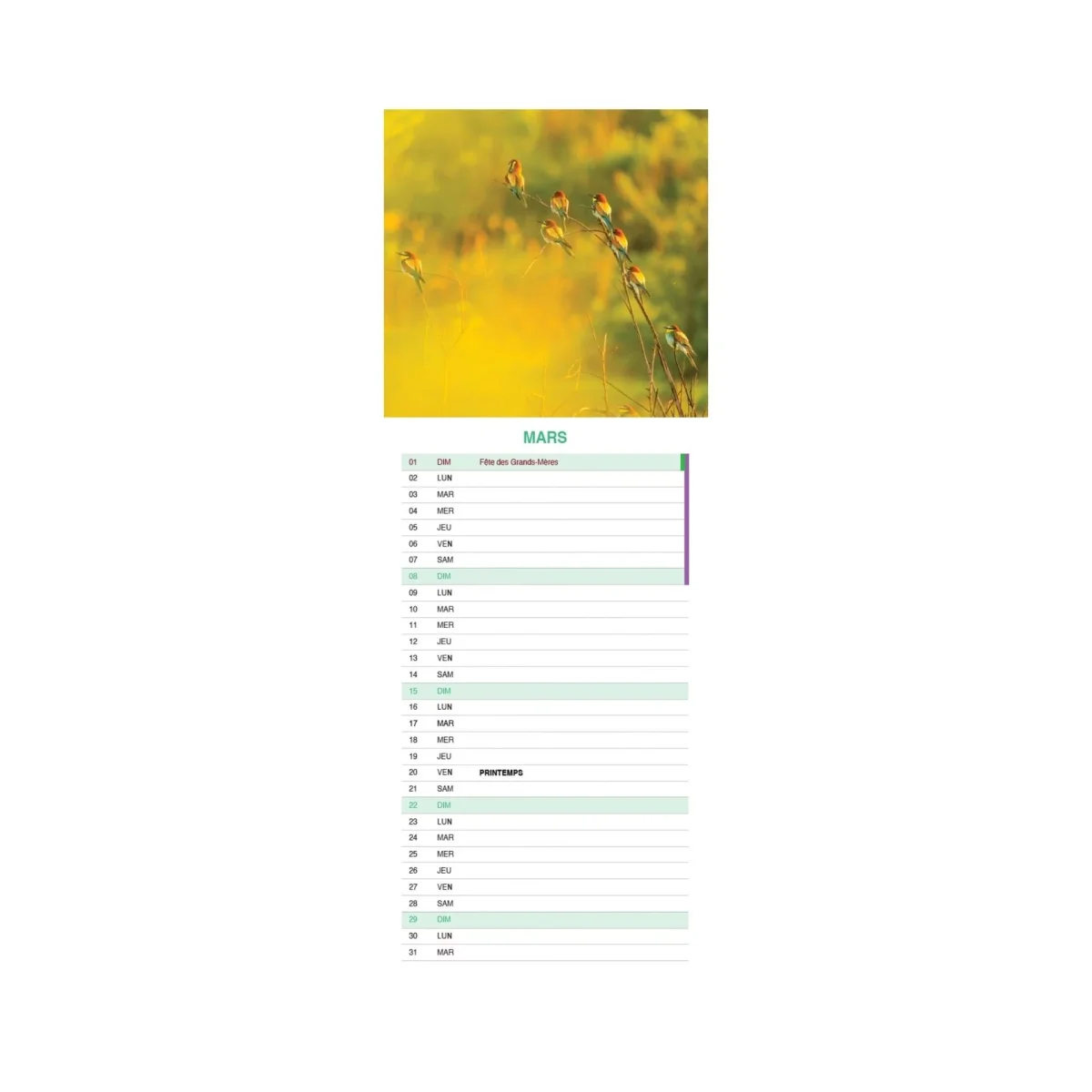 Laissez-vous bercer par la beauté des oiseaux. Chaque page de ce calendrier vous offre une superbe photo pleine de couleurs et de douceur, pour accompagner vos journées tout au long de l’année.