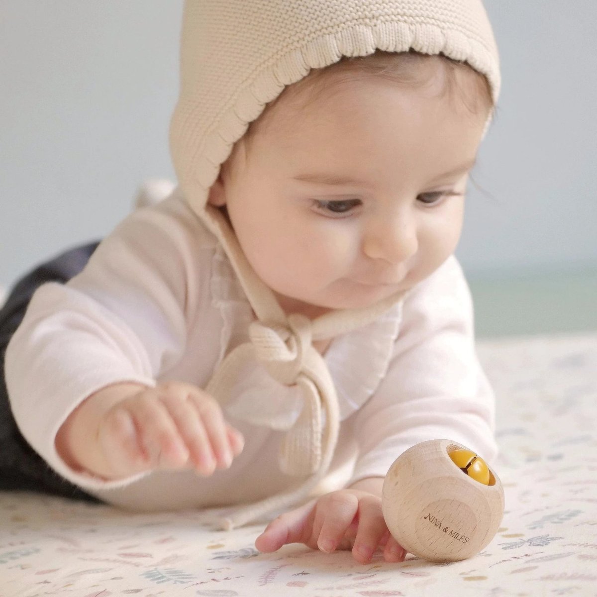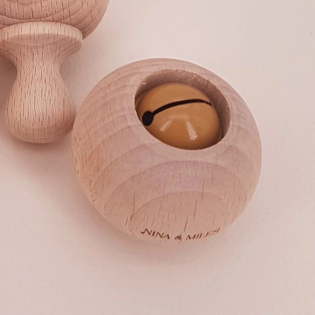 Matériaux : Bois hêtre non traité issu de forêts françaises durablement gérées – Grelot (fabrication allemande) conforme aux normes jouets EN 71 – Cordon élastique (à l’intérieur de l’objet)