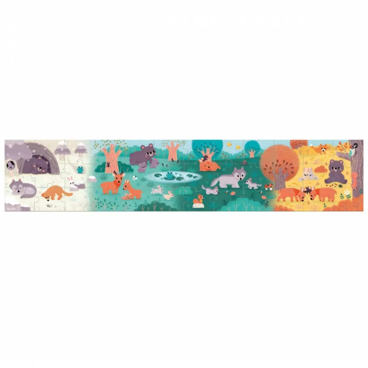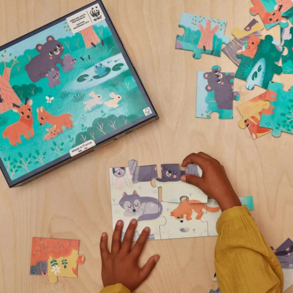 C’est parti pour la découverte de la vie de nos animaux sauvages préférés au fil des saisons ! Laissez les enfants découvrir pas à pas un univers de douceur grâce à ce joli puzzle panoramique de 36 pièces ! Une fois terminé, ce jeu de concentration en carton certifié FSC® mixte (bois issu de forêts gérées durablement) et fabriqué en France avec des encres végétales, mesure 1 mètre de long et permet de se plonger dans la vie de la forêt en hiver, printemps, été et enfin automne ! Un bon moyen pour les enfants dès 4 ans de s’imprégner des particularités de chaque saison tout en assouvissant leur passion pour les puzzles. Ce puzzle permet de développer la concentration, la logique, mais également la dextérité grâce à de grosses pièces adaptées aux petites mains. Un poster permettra d’aider les enfants lors des premières réalisations. Familles loups, ours et lapins attendent les petits pour l’exploration ! Ce jouet est développé en collaboration avec WWF.