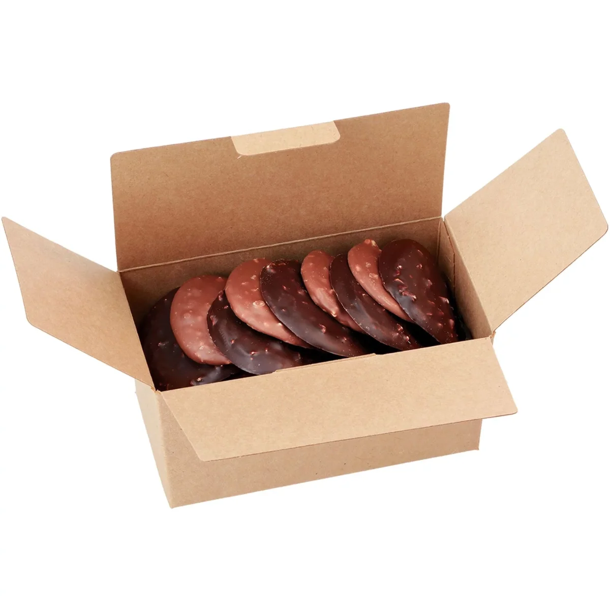 Fondez de plaisir pour cet assortiment de tuiles au chocolat au lait 37% de cacao et noir 72% de cacao avec des éclats de noisettes le tout présenté dans un ballotin dégustation 120g. L’onctuosité du chocolat au lait et l’intensité du chocolat noir associés au croquant des éclats sauront à coup sûr satisfaire vos papilles.