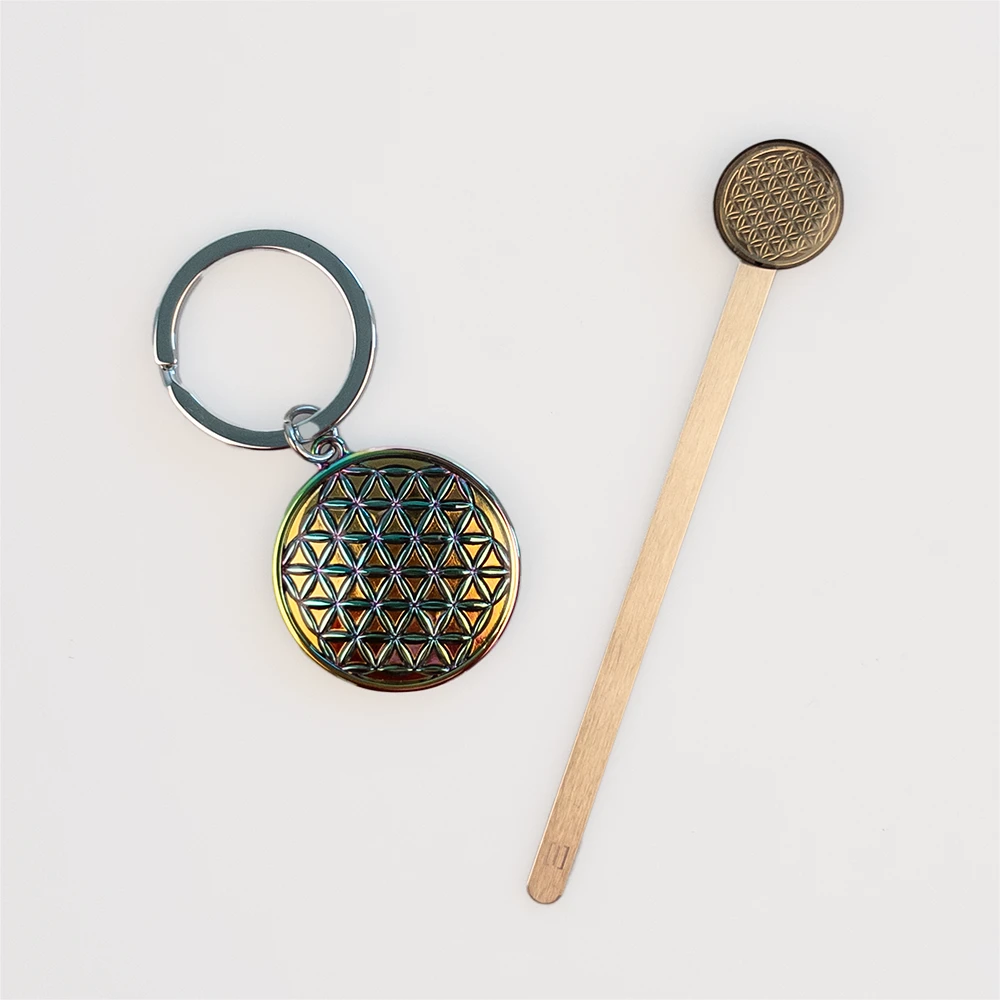 Ce petit coffret cadeau Metalmorphose se compose d’un porte-clés et d’un marque-pages tous deux ornés du symbole sacré de la Fleur de vie.