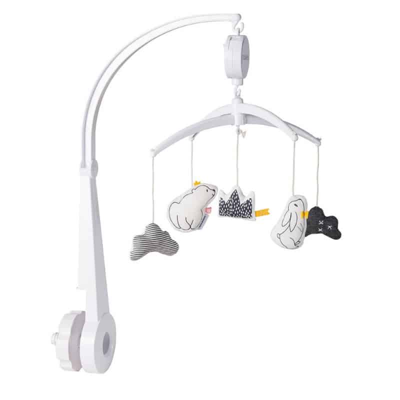 Le mobile musical Timeless aide bébé à s’endormir en douceur sous l’oeil bienveillant des peluches qui le composent. Pensez à retirer le mobile lorsque bébé commence à s’asseoir et à se lever afin d’éviter qu’il ne se suspende au mobile.
