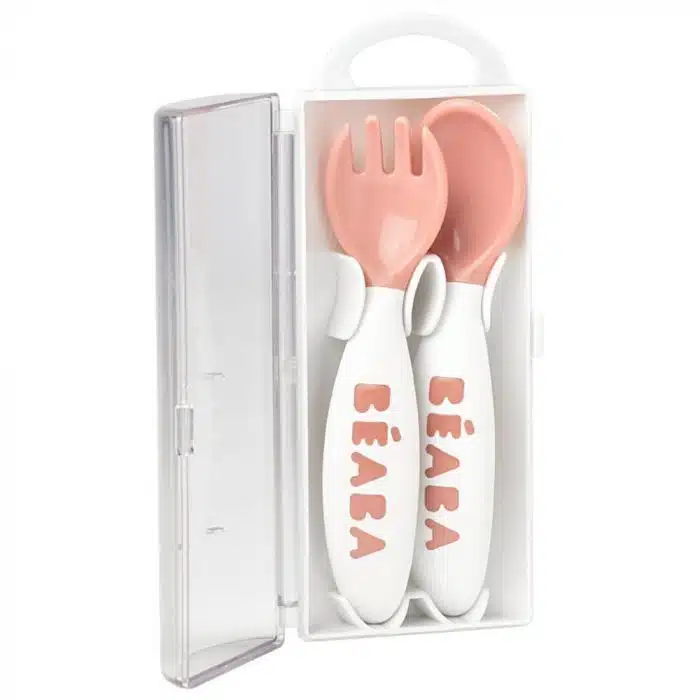Le set de 2 couverts ergonomiques 2ème âge + boîte de transport de Béaba apprend à votre petit à manger de manière autonome dès l’âge de 8 mois.